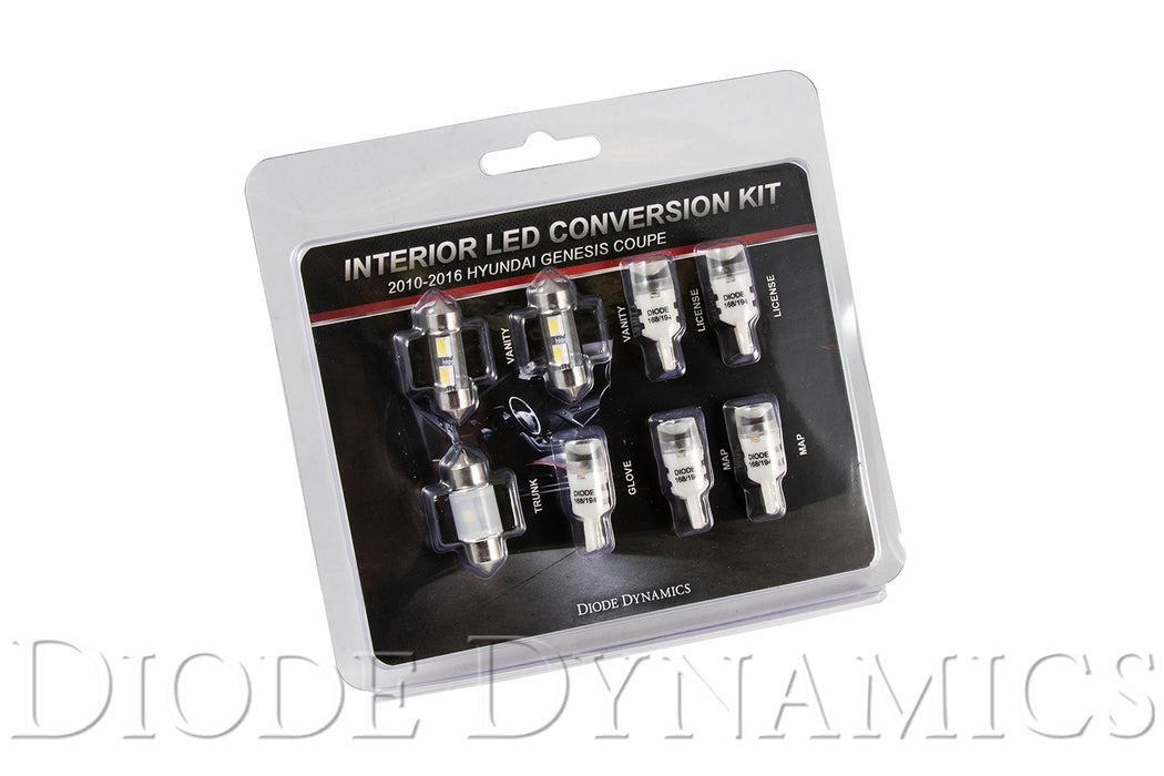 Upgrade. Add a modern appearance to your Hyundai Genesis Coupe with this Interior LED Conversion Kit. This kit includes all the LEDs you need to replace the factory vanity, glove, trunk, map, and license plate incandescent bulbs. These bright LEDs are available in a number of colors including cool white, red, and blue, to match your unique style.