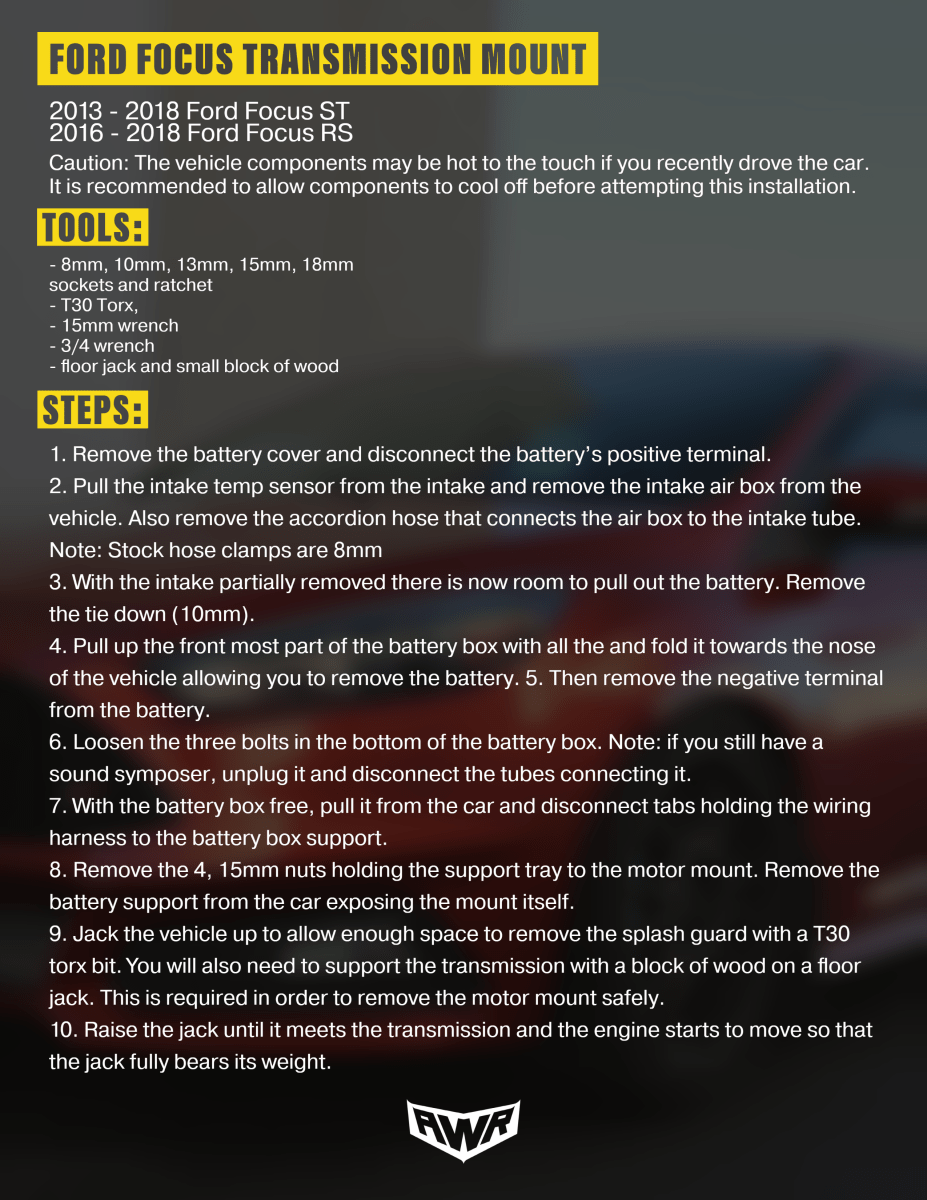 AWR Racing's 2013 - 2018 Ford Focus ST complete engine mount kit is a must-have for any ST owner. Want less engine movement, cleaner shifts, wheel hop to disappear, as well as many more benefits? Look no further - AWR Racing has you covered!Ā AWR offers the best-valued mounts that suit driver needs. We have durometer options for daily, aggressive, and track-driven builds. Our mounts have been street and track-proven since 1995.Ā