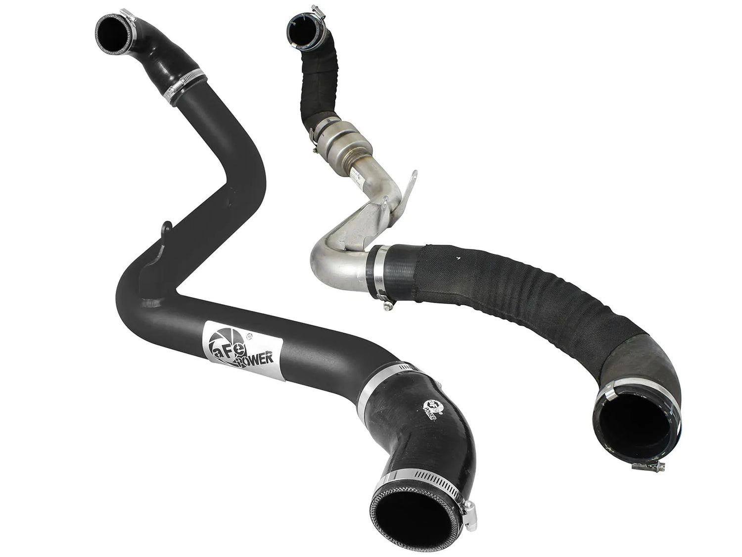 The full Hot & Cold Kit replaces both the hot and cold side intercooler tubes, while individual hot-side or cold-side pipes are available for selective upgrades. Each pipe includes high-quality stainless steel clamps, heavy-duty 5-PLY high-temp couplings, and utilizes OEM mounting points for a stable, hassle-free installation. Laser-cut aFe Power logo plates add an aggressive styling touch.