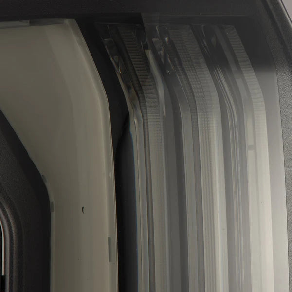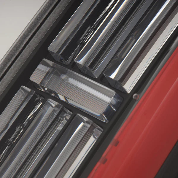 Each unit features four straight LED trapezoidal prisms that illuminate in bright red for the parking lights and intensify when braking. During turn signaling, amber LEDs activate sequentially across the prisms and LED side panel, producing a dynamic and attention-grabbing lighting effect. A central LED tube provides crisp white illumination for reverse lights, while the side LED tube adds to the parking light signature, mirroring the upscale style of modern Toyota trucks.