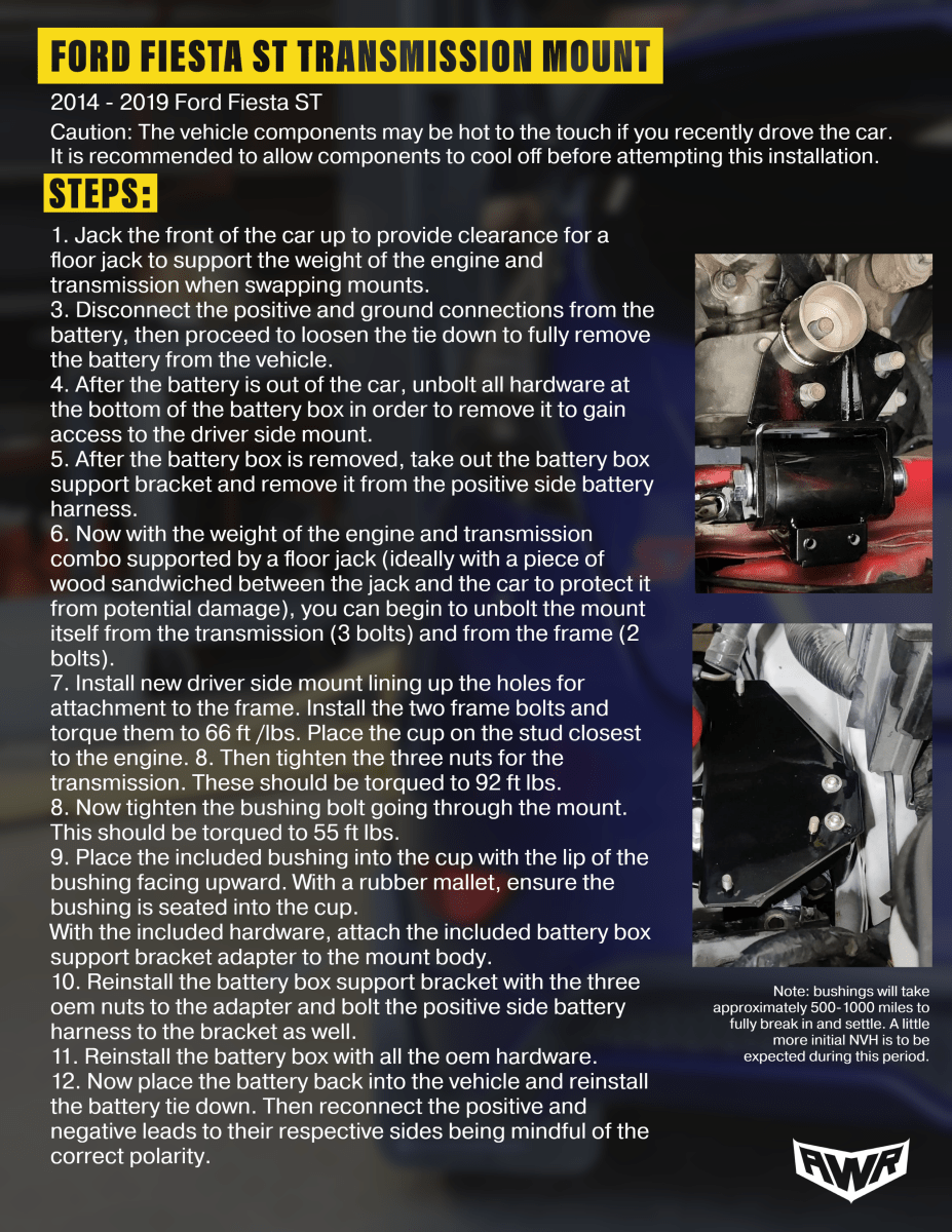 AWR Racing Ford Fiesta ST Engine Mount Kit - Black / 62 Durometer (ultra soft) is backordered and will ship as soon as it is back in stock.