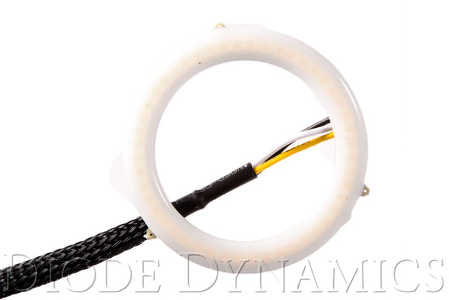 All input wires activate the halos, at different brightness levels. All amber-colored halos ship with low priority drivers. This means that if both low and high power inputs are powered, the LED will light up with low power level. This is convenient for connecting the red wire to a parking light or DRL signal, for use during the day as a high-power DRL. Then, if the white wire is connected to the headlamp power, they will dim down at night. If the yellow wire is powered at any time, the halo will light up at 200 percent brightness momentarily, intended for signalling (dims automatically if powered for more than two seconds).