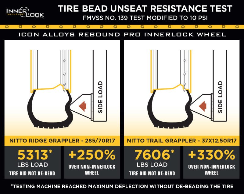 During an accelerated R&D process ICON engineers subjected theĀ RECON PROĀ to thousands of miles of real-world abuse throughout harsh and unforgiving environments. After on-vehicle testing was concluded, the Recon PRO was sent to an independent contractor for precise lab testing, specifically the FMVSS No.139 Tire Bead Unseat Resistance Test (modified to 10 psi). Results from multiple tests validated the effectiveness of ICONās InnerLock technology by exceeding the mechanical limits of the machine (over 7600lbs load) without ever de-beading the tire.