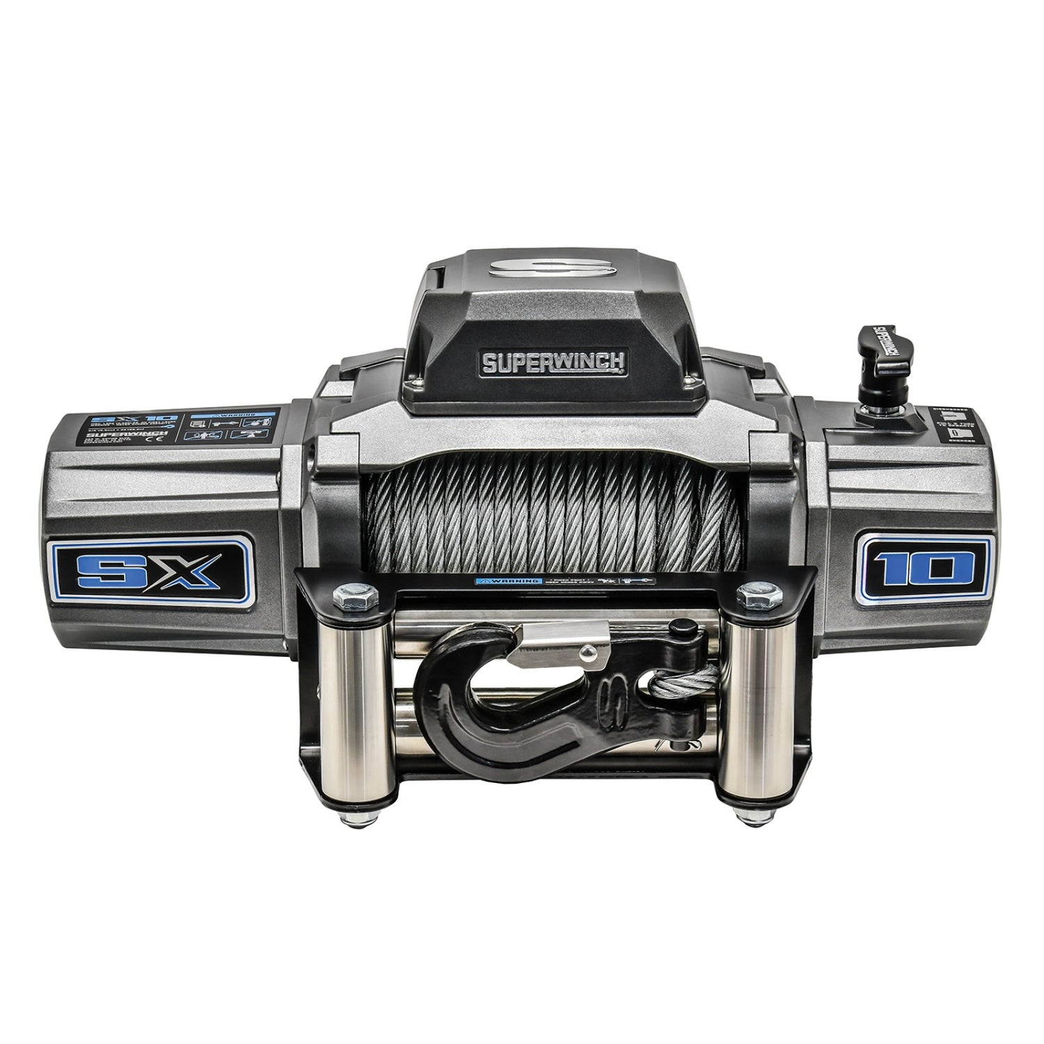 The SX10 winch is engineered to provide users with the ideal combination of power, speed, innovation, and proven performance they demand from Superwinch. Innovative features such as a patented drum light, relocatable die-cast aluminum control box, 3/8in diameter wire rope, and a 12ft lighted wired remote come standard. SX Series winches exceed the most demanding standards of today's modern vehicles, while delivering an affordable and stylish design which incorporates many class-leading features not found in other high-performance winches. Providing 10,000 lbs. of raw pulling power, the new SX10000 wire rope model has a sleek modern look and is built to last. With an IP68 rating for worry-free dustproof and waterproof operation, and a durable metallic graphite powder-coated finish, this winch has it all.